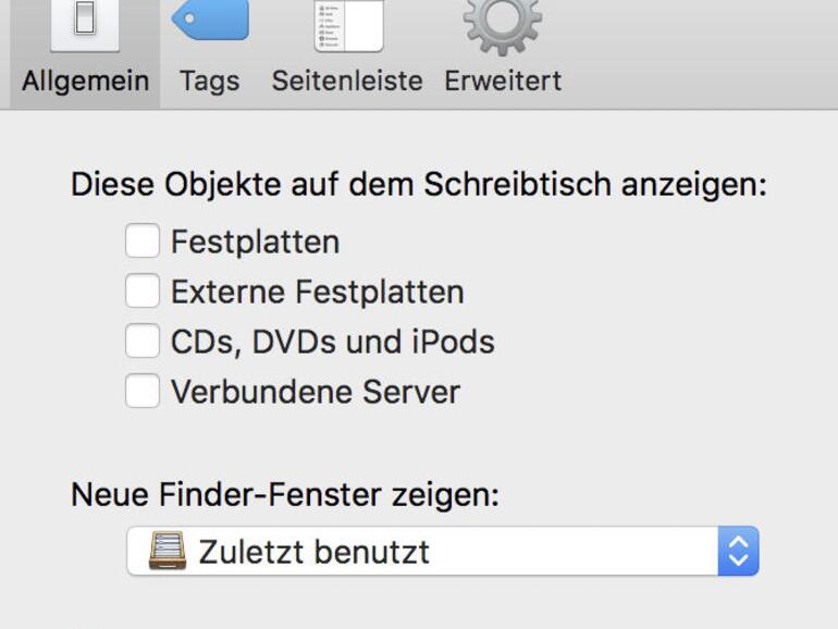 (Bild: Screenshot) Räumen Sie die Schreibtischoberfläche auf. Verbannen Sie alle Laufwerkssymbole vom Schreibtisch. Öffnen Sie die Einstellungen des Finders und entfernen Sie unter „Allgemein“ die Häkchen vor den Einträgen für die Laufwerke.