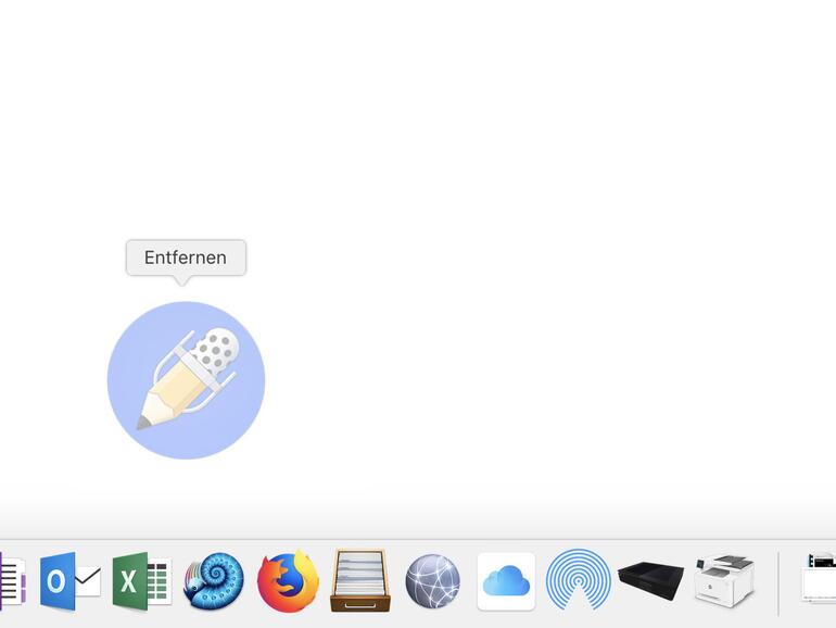 (Bild: Screenshot) Räumen Sie das Dock auf und entfernen Sie alle Symbole, die Sie nicht unbedingt benötigen. Dazu ziehen Sie diese vom Dock auf den Schreibtisch, bis am Symbol der Eintrag „Entfernen“ erscheint. Lassen Sie dann die Maustaste los.