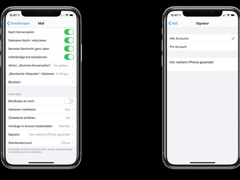 Im Gegensatz zu Signaturen am Mac können Sie unter iOS nur eine Signatur je E-Mail-Account anlegen oder, wie standardmäßig der Fall ist, eine für alle festlegen. Wählen Sie jetzt für unterschiedliche Signaturen „Pro Account“ aus. Sie können jetzt beispielsweise für Ihre geschäftliche E-Mail-Adresse eine andere Signatur einstellen als für Ihren privaten Account. Sobald Sie Ihre Signaturen angelegt haben, können Sie die Einstellungs-App wieder verlassen. Die Signaturen werden nun automatisch am Ende Ihrer E-Mails angehangen.