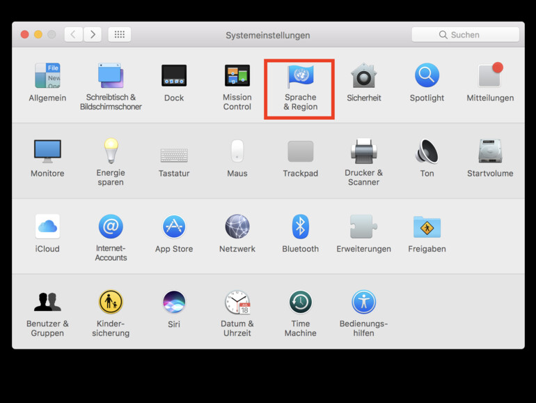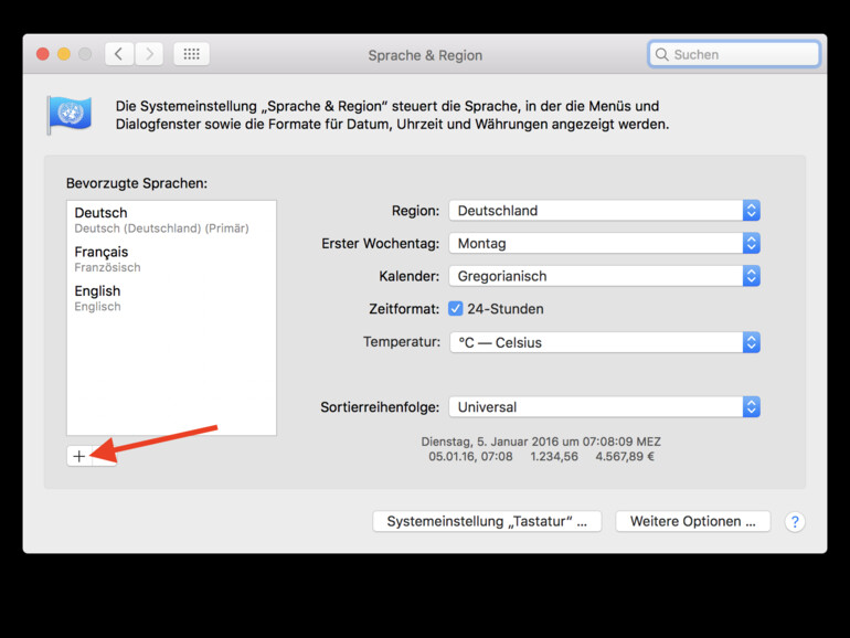 Klicken Sie zunächst auf das Apple-Logo in der Menüleiste am oberen Bildschirmrand. Wählen Sie dann aus dem Menü den Punkt „Systemeinstellungen“ aus. Öffnen Sie danach in den Einstellung „Sprache & Region“. Klicken Sie anschließend unter dem Bereich „Bevorzugte Sprachen“ auf das Plus-Symbol.