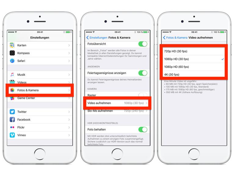 Hier können Sie sich für eine Videoauflösung entscheiden. Zur Auswahl stehen je nach iPhone-Generation folgende Optionen: „720p HD (30 fps)“, „1080p HD (30 fps)“, „1080p HD (60 fps)“ und „4K (30 fps)“.Je nach Auflösung variiert auch der benötigte Speicher. Bedenken Sie dies bei der Auswahl, denn eine Minute Video ist laut Apple: