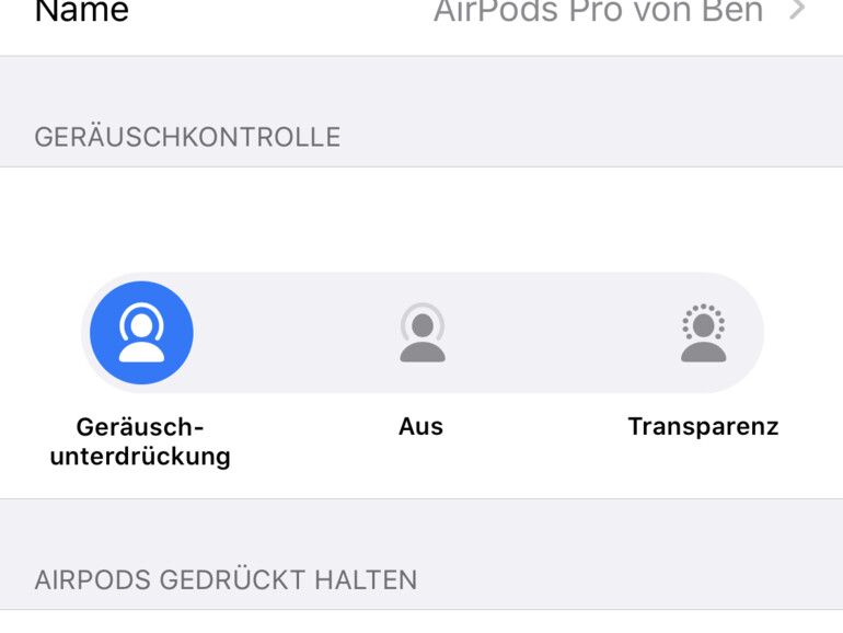 Am einfachsten können Sie zwischen der aktiven Geräuschunterdrückung und dem Transparenzmodus wechseln, wenn Sie die neue Steuermethode der AirPods Pro verwenden. Setzen Sie dazu die Ohrhörer ein und halten Sie kurz den Stiel eines Airpod gedrückt, sodass Sie ein Klicken und eine Änderung wahrnehmen. Standardmäßig wechseln Sie auf diese Art zwischen dem Transparenzmodus und der Geräuschunterdrückung.