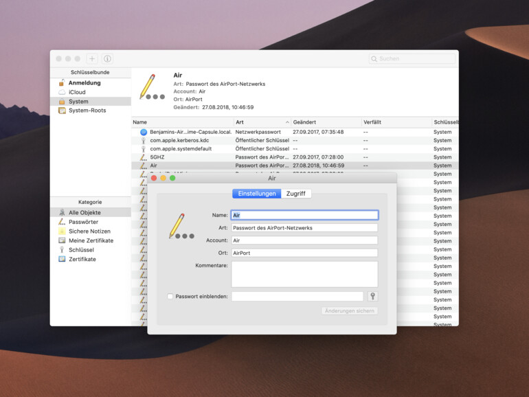 Neben dem WLAN-Passwort können Sie über den Schlüsselbund auch das Passwort für die Einstellungen des AirPort in der Schlüsselbundverwaltung nachschauen. Dazu suchen Sie unter „Namen“ die Bezeichnung der AirPort-Station neben der Kategorie „Kennwort der AirPort-Basisstation“. Doppelklicken Sie nun auf die Basisstation und setzen Sie einen Haken vor „Passwort einblenden“. Geben Sie auch hier die Administratorendaten des Macs ein und schon wird Ihnen das Passwort eingeblendet.