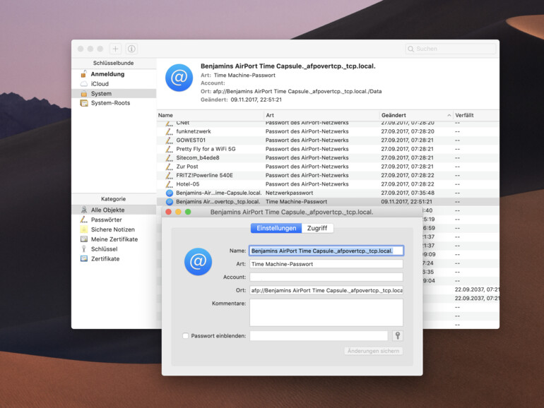 Sollten Sie hingegen keine Zugriff mehr auf die Festplatte haben, dann halten Sie in der Schlüsselbundverwaltung nach Ihrer Basisstation Ausschau. Achten Sie dabei jedoch auf die Art. Diese lautet für die Festplatte nämlich „Time Machine-Passwort“, kann aber auch „AirPort Festplatten-Passwort“ lauten. Doppelklicken Sie nun auf die Basisstation und setzen Sie einen Haken vor „Passwort einblenden“. Geben Sie wieder die Administratorendaten des Macs ein und schon wird Ihnen das Passwort eingeblendet.