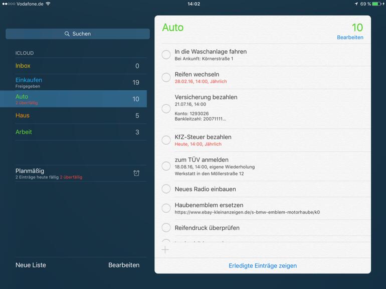 Bei der Fälligkeit einer Aufgabe bietet Apple je eine zeitliche und ortsgebundene Erinnerung. Neben einem festen Termin zu einer bestimmten Uhrzeit versteht sich Erinnerungen auch auf repetitive Termine, sodass Sie das Rausbringen der Mülltonnen oder die Fahrt zum TÜV nur einmal eintragen müssen, damit die Aufgaben automatisch 14-tägig oder im Abstand von zwei Jahren auf sich aufmerksam machen. An Einträge von der Einkaufsliste kann man sich auf Wunsch erinnern lassen, wenn man das entsprechende Geschäft passiert, das man zuvor mit seiner Adresse eingegeben hat.
