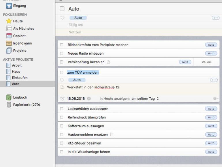Augenfällig an Things ist, dass die Software bei einem ähnlichen Aufbau deutlich ansprechender gestaltet ist als die Apple-Bordlösung. Neben dem globalen Eingang und den Projektordnern finden sich in der Seitenleiste mehrere sogenannte intelligente Ordner mit farbigen Programmsymbolen. Diese sammeln Aufgaben – unabhängig von den Verzeichnissen, in denen man sie tatsächlich abgelegt hat – nach Dringlichkeit. Mit einem Klick kann man sehen, welche Aufgaben heute, als nächstes oder – wenn eine Terminierung fehlt – irgendwann fällig sind.