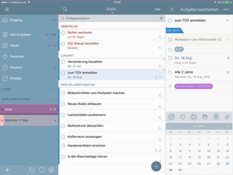 Sie optimieren Ihre Aufgaben, indem Sie sie mit einem Datum versehen. Gute To-do-Apps unterscheiden dabei zwischen Start- und Fälligkeitsdatum. So lässt sich die Steuererklärung ab Februar angehen, wenn alle benötigten Unterlagen eingetroffen sind. Die Abgabe ist hingegen auf den 31. Mai des Jahres festgelegt. Im besten Fall erlaubt eine Anpassung der Ansicht, dass Aufgaben gemäß ihrer Dringlichkeit in den Fokus rücken.
