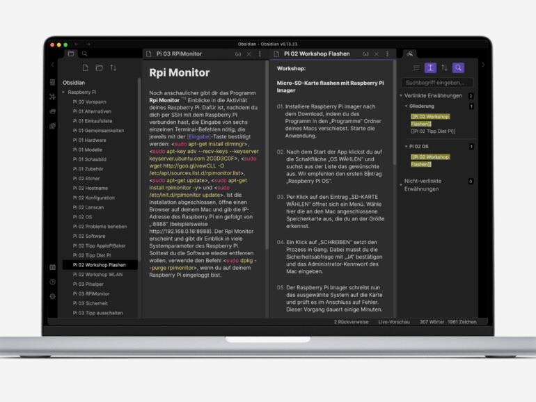 Auf den ersten flüchtigen Blick macht Obsidian einen unscheinbaren Eindruck. Das grundsätzlich kostenfreie Tool wirkt wie eine beliebige weitere Anwendung, um Notizen und kurze Texte zu verfassen. Tatsächlich ist das auch richtig, doch unter seiner schlichten Oberfläche besitzt Obsidian zahlreiche Funktionen, mit dem es der Notizen-Konkurrenz den Rang abläuft. Zum einen ist die Notizen-App für macOS sowie für iPhone und iPad erhältlich – die Mac-Version gibt es auf der Herstellerseite, die Mobil-Versionen im App Store. Über die iCloud gleichen die Apps ihre Anhalte untereinander ab. Eine auf dem iPhone hastig eingetippte Idee lässt sich so am Mac in aller Ruhe ausarbeiten. Darüber hinaus bieten die Entwickler:innen auch Apps für Windows, Android und Linux, die sich gegen einen monatlichen Aufpreis in den Datenabgleich zu den Apple-Versionen einbinden lassen.