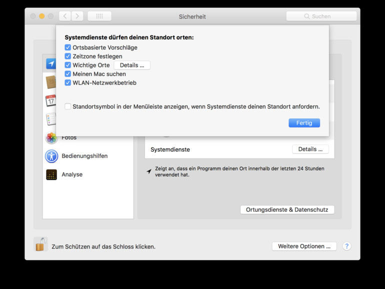 Am Mac können nur wenige Einstellungen am Ortungsdienst vorgenommen werden. iOS bietet dabei eine deutliche bessere Kontrolle. Nichtsdestotrotz können einfache Änderungen vorgenommen werden. So lässt sich in den Sicherheitseinstellungen der Ortungsdienst völlig abschalten, indem man den Haken vor „Ortungsdienste aktivieren“ entfernt.