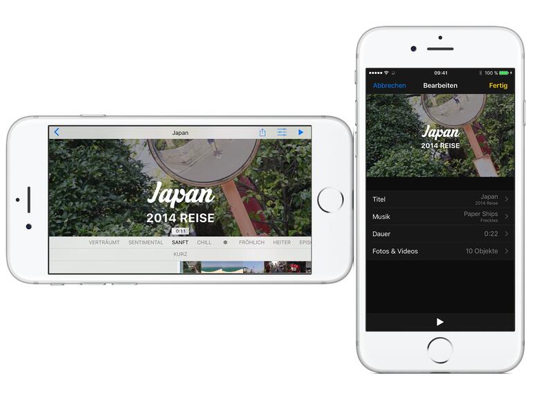 Nach kurzer Zeit startet das Video automatisch. Jetzt tippen Sie auf das Video und ein Menü erscheint. Unter dem Video kann man schnell die Stimmung sowie die Länge des Videos festlegen. Wenn Sie auf das Symbol mit den Reglern tippen, können Sie die Einstellungen verfeinern.