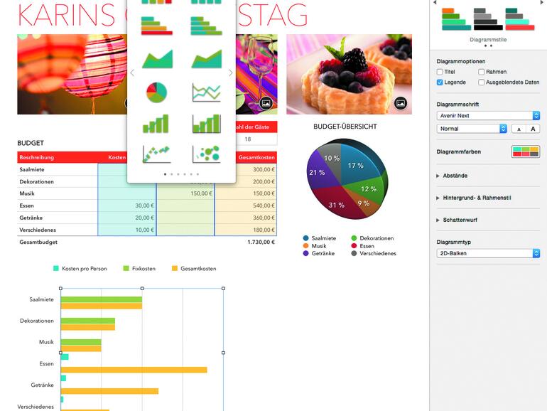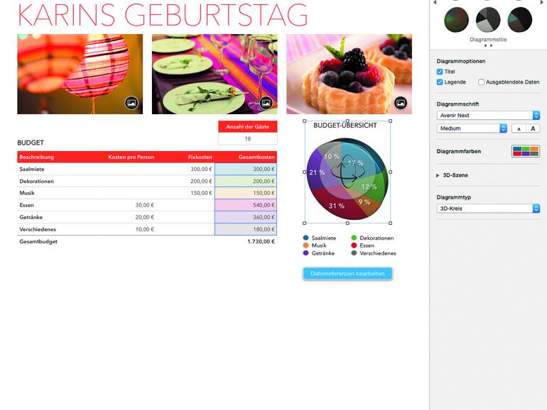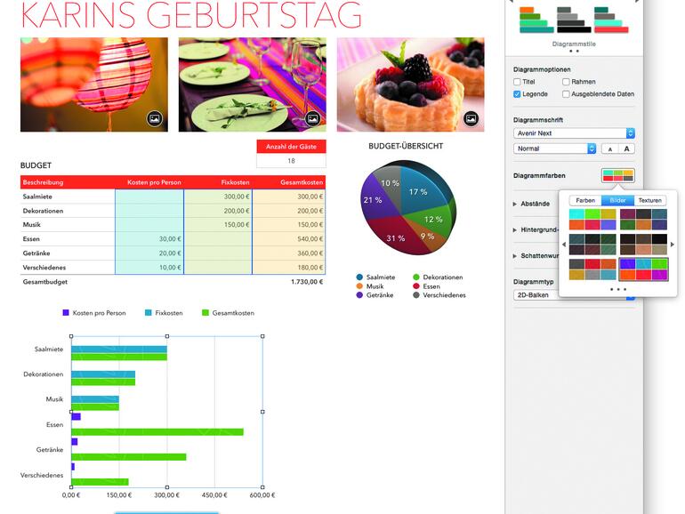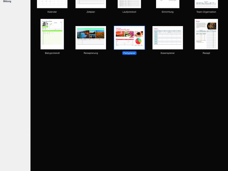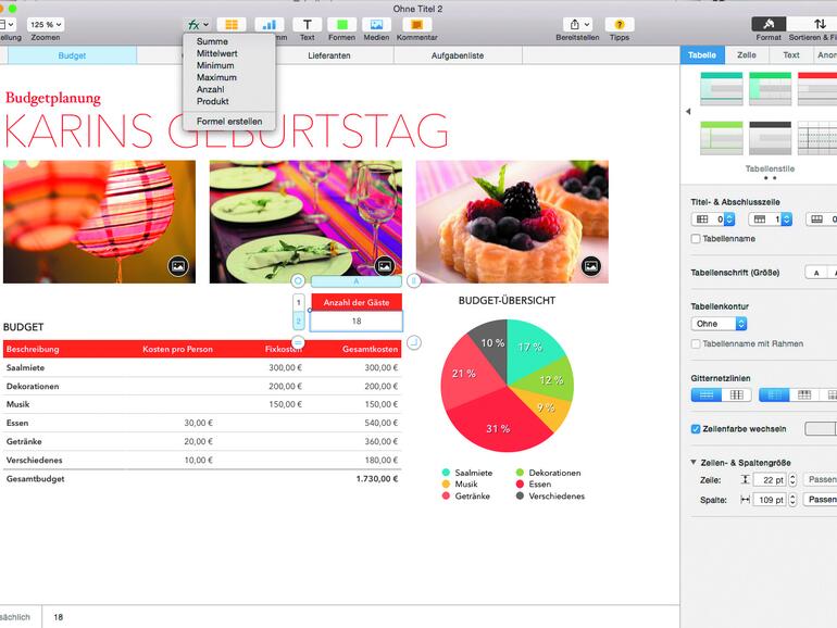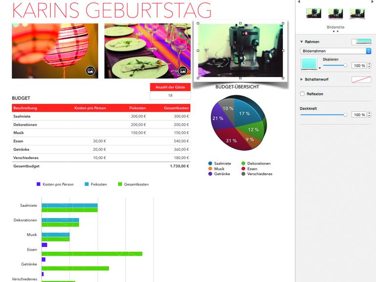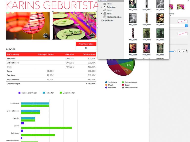 - Apple iWork: Die wichtigsten Tipps und Tricks für Numbers - so erstellen Sie auf einfache Art die besten Tabellen - Schritt 1:- Wählen Sie aus den Vorlagen „Neues Dokument“ und in der Rubrik „Privat“ das Blatt „Partyplaner“. Es erscheint ein Formular mit Tabelle, Fotos und Diagramm.
