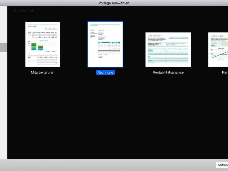 - Apple iWork: Die wichtigsten Tipps und Tricks für Numbers - so erstellen Sie auf einfache Art die besten Tabellen - Schritt 7:- Wählen Sie nach dem Start von Numbers „Neues Dokument“ und anschließend in der Rubrik „Geschäftlich“ die Vorlage „Rechnung“. Es erscheint ein vorgegebenes Formular.