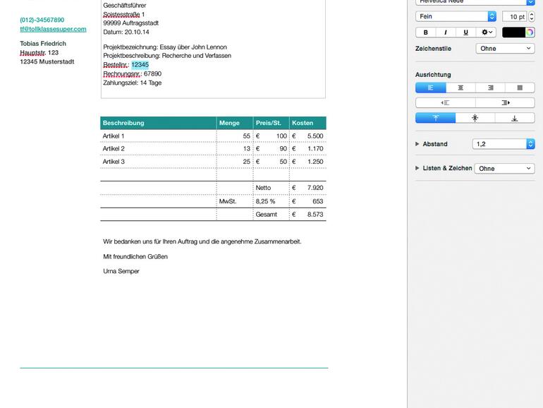 - Apple iWork: Die wichtigsten Tipps und Tricks für Numbers - so erstellen Sie auf einfache Art die besten Tabellen - Schritt 14:- Wollen Sie die Schrift Ihrer Rechnung ändern, klicken Sie in die einzelnen Textkästen, aktivieren Sie den Text und suchen Sie sich in der Format-Spalte eine neue Schrift aus.