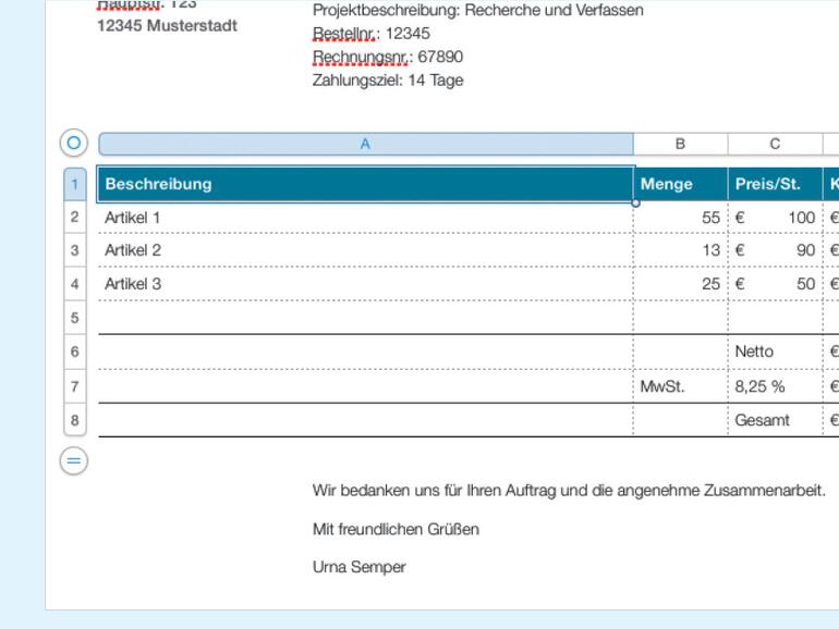 - Apple iWork: Die wichtigsten Tipps und Tricks für Numbers - so erstellen Sie auf einfache Art die besten Tabellen - Schritt 1:- Wählen Sie nach dem Start von Numbers „Neues Dokument“ und anschließend in der Rubrik „Geschäftlich“ die Vorlage „Rechnung“. Es erscheint ein vorgegebenes Formular.