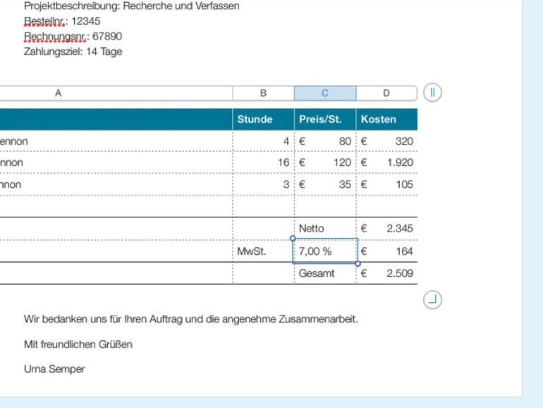 - Apple iWork: Die wichtigsten Tipps und Tricks für Numbers - so erstellen Sie auf einfache Art die besten Tabellen - Schritt 6:- Sollte die Mehrwertsteuer nicht stimmen, kann auch dies einfach behoben werden. Klicken Sie in Feld C7 und geben Sie einen neuen Wert ein, in unserem Beispiel 7 %.