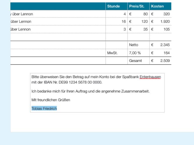 - Apple iWork: Die wichtigsten Tipps und Tricks für Numbers - so erstellen Sie auf einfache Art die besten Tabellen - Schritt 13:- Um nun noch Kontodaten einzufügen, klicken Sie unter der Tabelle in das Textfeld vor dem ersten Wort und fügen Ihre persönlichen Angaben ein sowie den textlichen Abschluss.