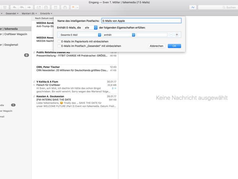 Öffnen Sie das Menü „Postfach“ von Apple Mail und wählen Sie den Befehl „Neues intelligentes Postfach“ aus. Geben Sie dem intelligenten Postfach einen aussagekräftigen Namen, etwa „E-Mails von Apple“.