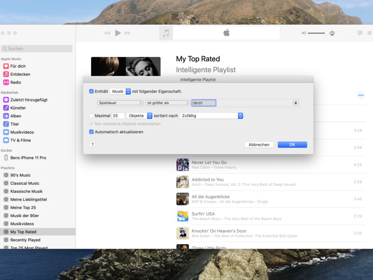 Öffne die Musik-App auf deinem Mac und klicke in der Menüleiste auf „Ablage > Neue intelligente Playlist“. Nutzt du macOS Mojave oder älter, dann fahre in iTunes fort. Wähle hinter „Enthält“ die Option Musik“ aus und lege als Eigenschaft „Spieldauer ist größer als 00:01“ fest. Entferne den Haken vor den maximalen Objekten. Setze weiter unten einen Haken vor „Automatisch aktualisieren“ und klicke anschließend auf „OK“. Lege jetzt noch einen Namen fest, um deine Playlist schnell wiederzufinden.