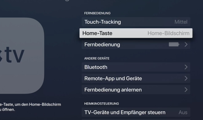 Seitdem Apple die TV-App tief in das System integriert hat, bringt dich ein Druck auf die TV-Taste stets in die App zurück. Wenn man die Anwendungen jedoch nicht verwenden und stattdessen wie gewohnt auf den Home-Bildschirm zurück gelangen möchte, dann ist dies ebenfalls möglich. Öffne dazu „Einstellungen > Fernbedienungen und Geräte“. Dort siehst du den Eintrag „Home-Taste“. Klicke darauf, um die Aktion zu ändern.