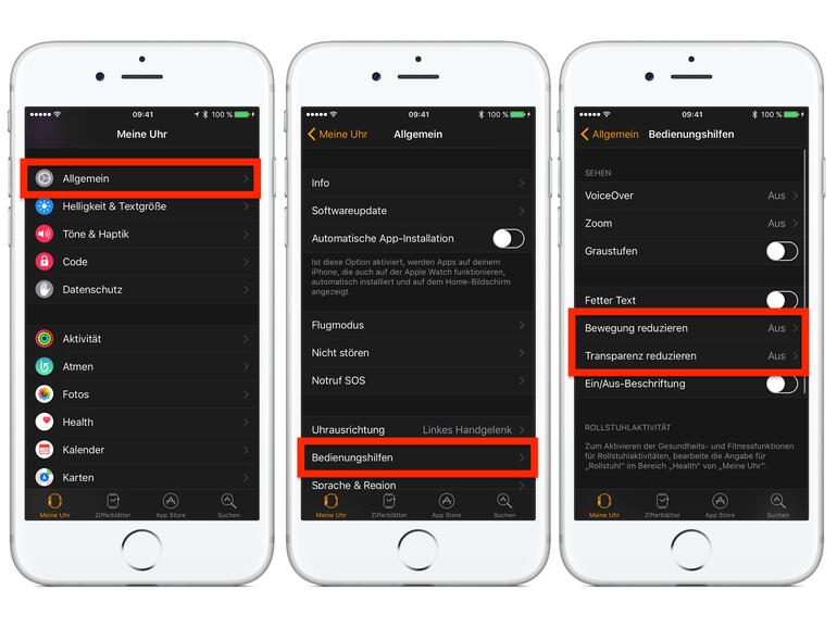 Wie beim iPhone kosten Displayanimationen auch auf der Apple Watch wertvolle Energie. Diese lassen sich daher ganz einfach ausschalten. Man öffnet dazu die Watch-App auf dem iPhone und wählt „Allgemein" → „Bedienungshilfen" → „Bewegung reduzieren" aus. Dort zieht man den Schieberegler nach rechts und schon sind die Animationen deaktiviert. Geht man nun zurück zu den Bedienungshilfen lohnt es sich auch die Transparenz zu reduzieren. Die entsprechende Option befindet sich genau unter „Bewegung reduzieren".
