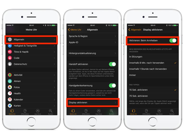 Damit das Display nicht bei einfachen Handbewegungen angeht und somit kostbare Akkulaufzeit verschwendet, sollten das Aktivierem beim Anheben deaktivieren. Dazu öffnen Sie die Watch-App auf Ihrem iPhone, wählen „Allgemein" → „Display aktivieren" aus und ziehen dort den Schieberegler neben „Aktivieren: Beim Armheben" nach links, um es zu deaktivieren. Zukünftig können Sie durch das Drücken von Tasten und über das Drehen an der Krone das Display aufwecken.