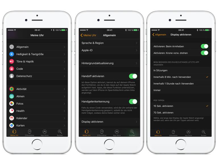 Wenn Sie das Display der Apple Watch per Armheben aktivieren, haben Sie sicherlich schon festgestellt, dass es nicht lange aktiv bleibt. Bis zu 70 Sekunden kann es anbleiben, wenn Sie es per Antippen oder das Drücken einer Taste aufwecken. Die Zeit lässt sich in der Watch-App Ihres iPhone einstellen. Gehen Sie dazu in „Allgemein > Display aktivieren“ und tippen die gewünschte Einstellung am unteren Ende an. Sie haben jedoch nur die Auswahl zwischen „15 Sek. aktivieren“ und „70 Sek. aktivieren“.