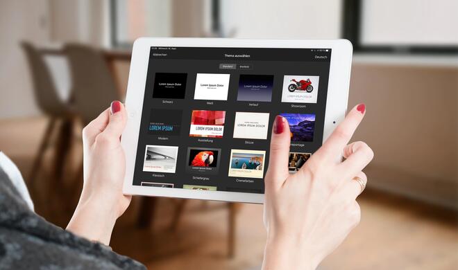 Überzeugende Präsentationen. Wer schon immer mal wie Steve Jobs oder Tim Cook eine Präsentation halten wollte, kann das mit Apples Keynote-App auf dem iPad tun. Hier finden Sie nicht nur ansprechende Designs und elegante Folienübergänge. Durch die simple Bedienung erstellen Sie mit der App auch auf dem Tablet komplette Präsentationen. Diese können Sie anschließend über einen Apple TV direkt per AirPlay an den Beamer oder Fernseher im Seminarraum übertragen.