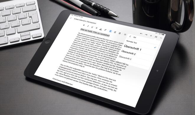 Darüber hinaus ist der Uni-Alltag aber auch von aktiver Zusammenarbeit geprägt. Oftmals müssen Sie mit Ihren Kommilitoninnen und Kommilitonen aktiv zusammenarbeiten. Mit den richtigen Werkzeugen geht das auch auf dem iPad. Google Docs ist zum Beispiel ideal für die Zusammenarbeit an Texten. Das können gemeinsame Hausarbeiten oder Referatsausarbeitungen sein. Vorträge können Sie mit Keynote ebenfalls direkt auf dem iPad ausarbeiten und auch per AirPlay präsentieren. Meistens beginnt die Arbeit aber mit Brainstorming. Auch dafür gibt es die richtigen iPad-Anwendungen. MindNode 6 hilft Ihnen beim Erstellen von Mind-Maps. Mit Inko machen Sie aus dem iPad ein Whiteboard.