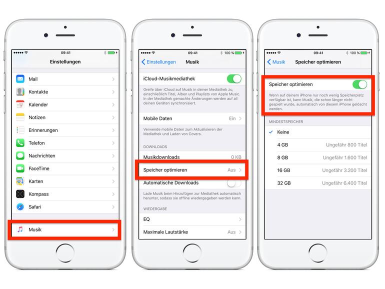 Sollten Sie wieder einmal nur noch wenig Speicherplatz auf Ihrem iPhone haben, können Sie sich Ihren Musikspeicher automatisch optimieren lassen. Beachten Sie dabei, dass die Einstellung den Speicher für Musik nicht dauerhaft begrenzt. Kurz gesagt, bedeutet die Option nicht, dass der Musikspeicher stets nur einen eingestellten Maximalwert annehmen kann. Es bedeutet, dass immer mindestens soviel Speicher für Musik bereitgestellt wird. Im Falle einer Speicherknappheit werden dann länger nicht gespielte Titel entfernt, bis der dieser Mindestspeicher erreicht ist.