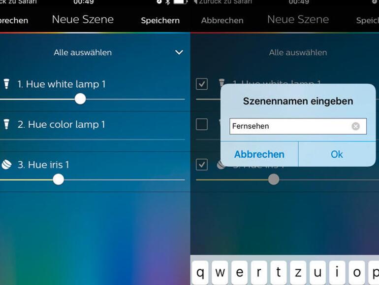 Wähle beim Einstellen oben „Erstellen“, um Lampen zu einer Szene zusammenzufassen. Du konfigurierst die Lampen und wählst, welche dabei sein soll. Tippe oben auf „Speichern“, und benenne die Szene.