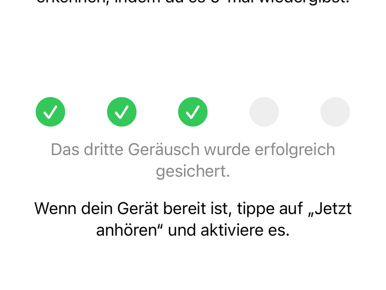 - Besser hören mit Apple - Schritt 3:- Zum Schluss speicherst du die Aufnahmen und wartest, bis dein iPhone das Training beendet hat. Sobald du deine individuelle Geräuscherkennung nutzen kannst, erhältst du eine Nachricht auf dem Smartphone.