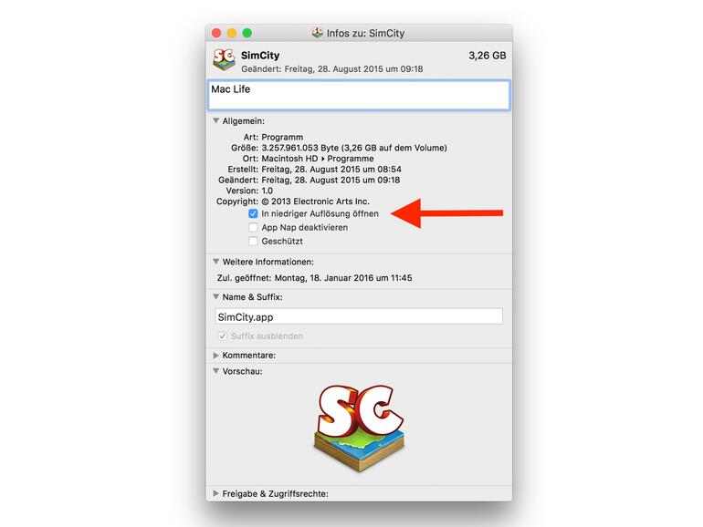 Suchen Sie nach dem Computerspiel, dessen Leistung Sie etwas verbessern möchten. Rechtsklicken Sie dann auf das Spiel und klicken danach im Kontextmenü auf den Punkt "Informationen" Setzen Sie nun einen Haken bei "In niedrieger Auflösung öffnen" und schließen das Informationsfenster wieder. Starten Sie jetzt das Computerspiel und Sie werden einen deutlichen Leistungsschub erleben.