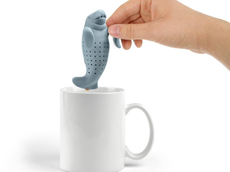 Eigentlich bin ich ein Kaffee-Liebhaber, neige aber im Winter neige ich dazu, mehr Tee zu trinken. Dafür kommt die kleine „ManaTea“-Seekuh (= Manatee) genau richtig: Das knuffige Tee-Ei hängt mit den Vorderflossen über den Tassenrand.