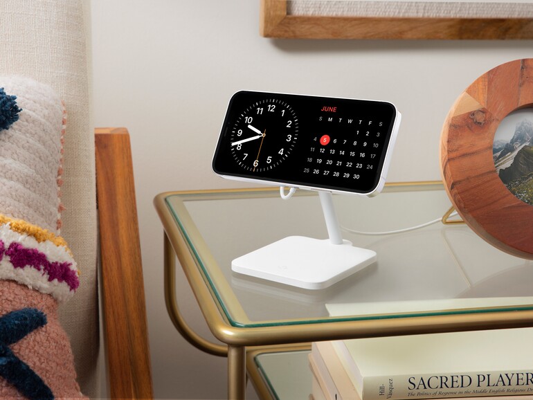Der schicke Forté-Ständer kommt als Bausatz. Er nimmt Apples MagSafe Ladegerät auf und hält das iPhone magnetisch sowohl vertikal als auch, relevant für StandBy, horizontal. Nach hinten kippt das Lademodul bis zu 70 Grad, so lassen sich auch AirPods laden. Apples Ladepuck lässt sich leicht wieder entnehmen, was die Kombination perfekt ...