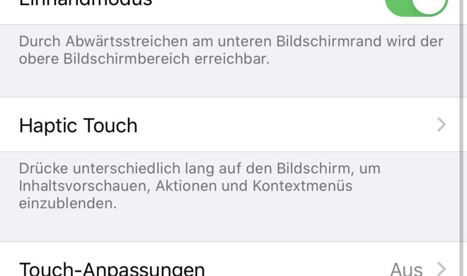 Wie bei allen iPhone-Modellen mit 4,7-Zoll-Display (oder größer) lässt sich auch am iPhone SE der Einhandmodus aktivieren, um Inhalte für den Daumen einfacher erreichbar zu machen. Öffne dazu die Einstellungen-App und tippe dort auf „Bedienungshilfen“. Wähle nun den Eintrag „Tippen“ aus und ziehe dann den Regler neben „Einhandmodus“ nach rechts, damit dieser zur Verfügung steht. Du kannst jetzt die Einstellungen wieder verlassen.