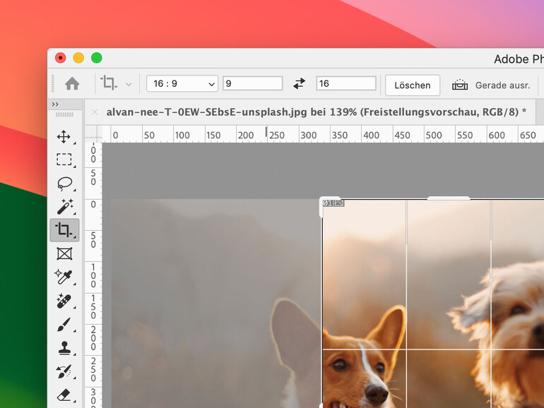 Aktiviere das Freistellungswerkzeug (Taste C) und wähle oben in der Optionsleiste das Seitenverhältnis 16:9. Mit den beiden Pfeilen kannst du die Ausrichtung ändern.