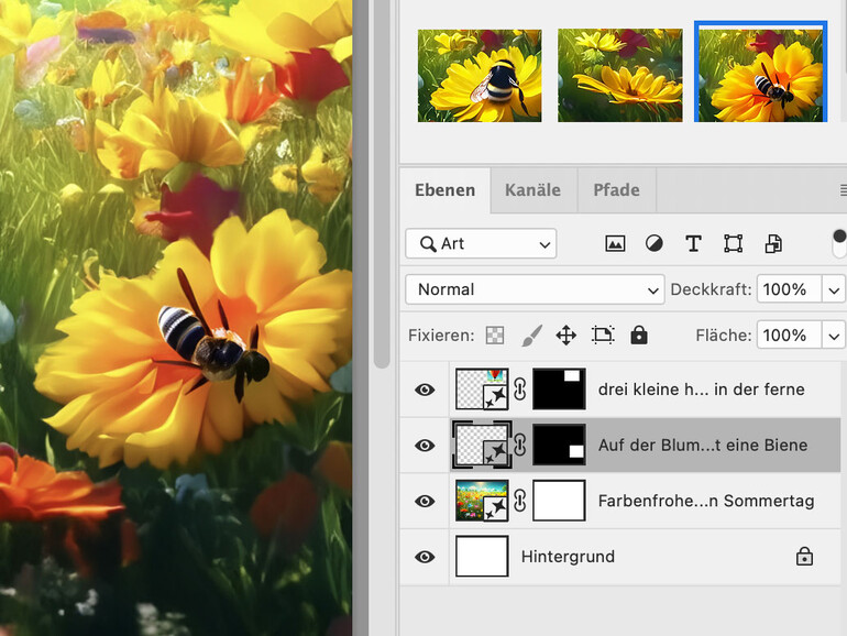 Du kannst auch nur Teile des Bildes auswählen und mit Hilfe der Generativen Füllung verändern. In unserem Fall sollte noch eine Biene auf der Blume sitzen.