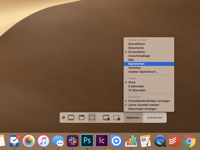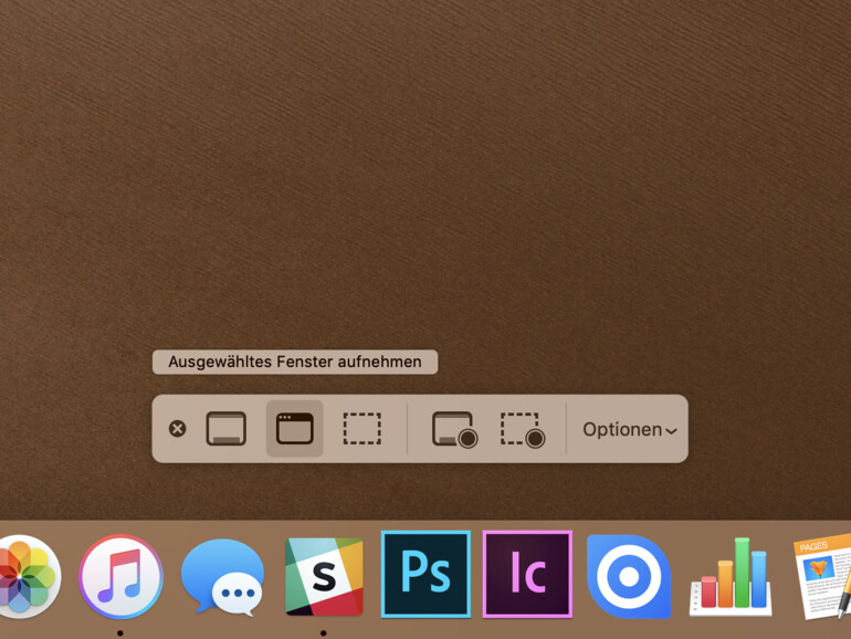 Entscheidest du dich etwa für „Ausgewähltes Fenster aufnehmen“, klickst du einfach ein Fenster an – sofort wird ein Screenshot erstellt. Eine Vorschau ist kurzzeitig unten rechts verfügbar. Möchtest du hingegen den gesamten Bildschirm als Video aufnehmen, dann klickest du die Option im zweiten Feld an und danach auf „Aufnehmen“. Die Aufnahme beendest du, indem du in der Menüleiste auf das „Stopp“-Icon klickst.