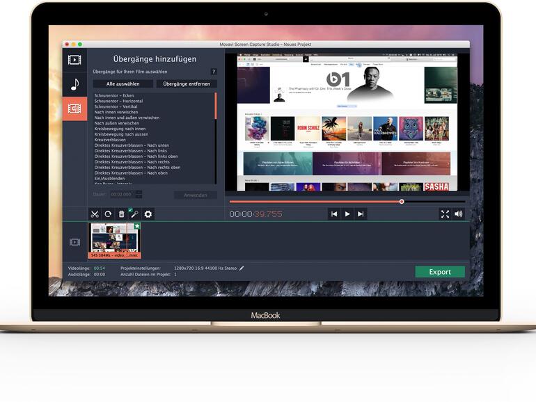 Das Movavi Screen Capture Studio kommt mit vier Musikthemen, die Sie frei für Ihre Videos verwenden können. Natürlich können Sie aber auch eigene Songs integrieren. Beim Inszenieren des Wechsels zwischen einzelnen Szenen hilft Ihnen die große Auswahl an Übergängen.