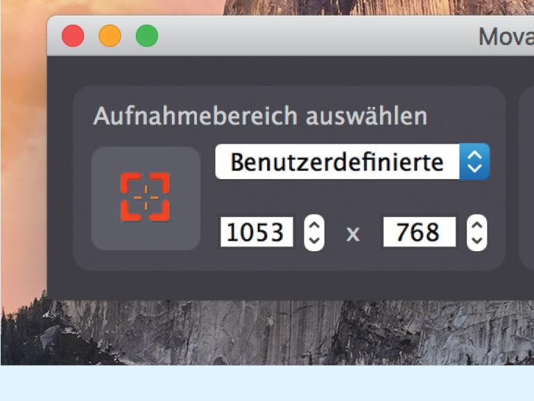 Wählen Sie zunächst den gewünschten Aufnahmebereich. Im Ausklapp-Menü finden Sie neben „Vollbild“ noch weitere Auflösungen zur Auswahl. Alternativ können Sie den Bereich pixelgenau bestimmen.