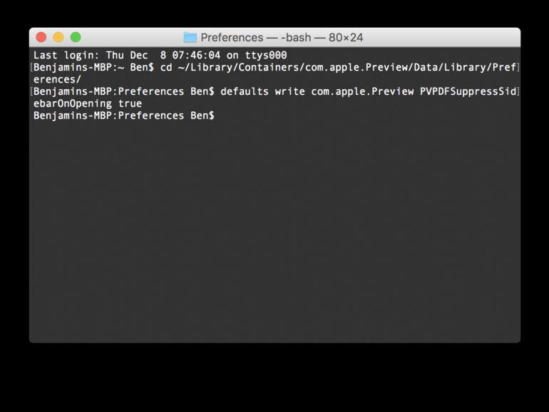 defaults write com.apple.Preview PVPDFSuppressSidebarOnOpening true