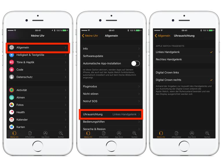 Nehmen Sie das mit der Apple Watch gekoppelte iPhone zur Hand und öffnen Sie die Watch-App. Wählen Sie im Reiter „Meine Uhr" den Menüpunkt „Allgemein" aus. Im dritten Einstellungsblock sehen Sie „Uhrausrichtung". Tippen Sie darauf. Wählen Sie nun die Trageseite und die damit veränderte Ausrichtung der Digital Crown aus. Anschließend können Sie die Watch-App wieder verlassen.
