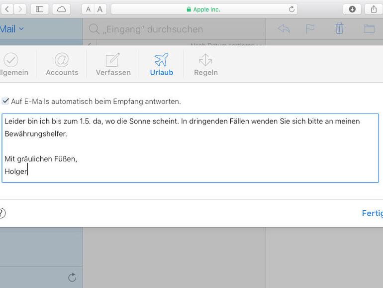 Mails lassen sich über den Browser mit einigem Komfort nutzen. Über das Zahnradsymbol lassen sich Einstellungen für iCloud Mail treffen. Dazu zählen Alias-Accounts, Regeln und automatische Abwesenheitsnotizen.