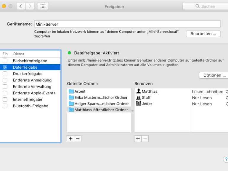 Neben den Benutzerkonten und deren öffentlichen Ordnern können Sie über die Freigabeeinstellungen weitere Ordner zur Nutzung im Netz auswählen. Diese werden dann unter Berücksichtigung der Zugriffsrechte nach der Anmeldung aus dem Netz angeboten und als Netzwerkvolumes auf dem zugreifenden Client-Mac gemountet. So können Sie durch geeignete Kombinationen von Benutzerkonten, Zugriffsrechten und Freigabeeinstellungen maßgeschneiderte Angebote für den Datenaustausch und die gemeinsame Arbeit an Dateien erstellen.