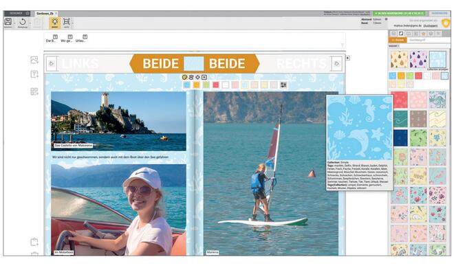 In Designer 3 statten Sie Ihre Buchseiten einfach durch Ziehen auf die Seite mit schönen und thematisch passenden Hintergründen aus. Diese lassen sich per Texteingabe filtern, farblich anpassen, auf eine einzelne oder die Doppelseite anwenden und mit den cleveren Tools der Software variieren.