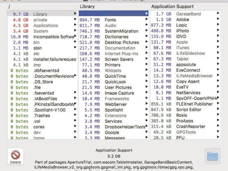 Ein alter Bekannter ist das Dienstprogramm OmniDiskSweeper. Dieses Tool zeigt die größten Speicherfresser auf der Festplatte an. Aus der Liste heraus lassen sich alle Dateien umgehend löschen. Daher ist Vorsicht geboten. Unverzichtbar ist OmniDiskSweeper, wenn man schnell eine bestimmte Datenmenge auf externen Festplatten freischaufeln muss oder wenn man einen Ordner zum Brennen als DVD vorbereiten möchte.