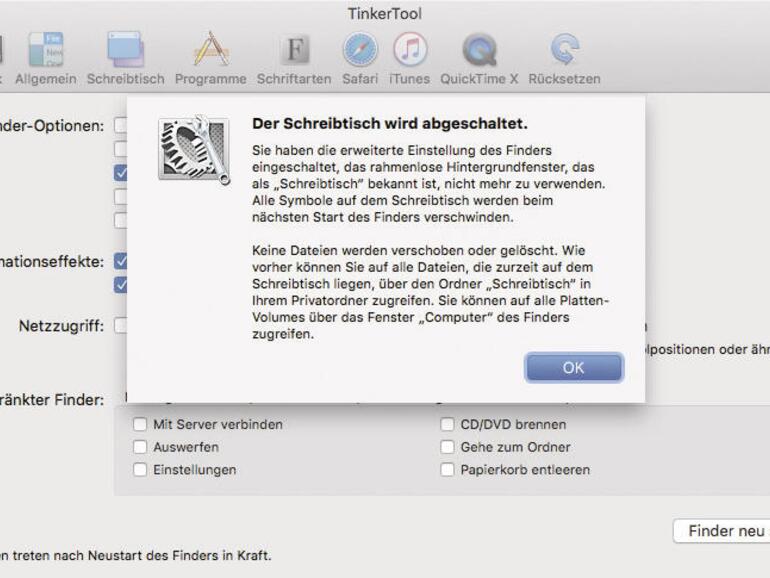 Rund um das System ist TinkerTool unverzichtbar. Es ermöglicht Anpassungen am Finder und vielen Programmen und systemeigenem Funktionen von OS X, die sich nicht in den Voreinstellungen oder Systemeinstellungen befinden. TinkerTool nimmt dem Anwender die Eingabe von möglicherweise fehlerhaften Terminal-Befehlen wie defaults write com.apple.finder CreateDesktop -bool FALSE;killall Finder ab, wenn man den Schreibtisch ausblenden möchte, weil es sauberer aussieht.