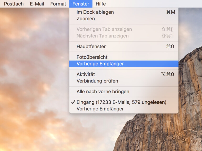 Öffnen Sie zunächst die Mail-App auf Ihrem Mac. Diese finden Sie standardmäßig im Dock oder im Finder im Programme-Ordner. Klicken Sie in der Menüleiste am oberen Bildschirmrand auf den Punkt „Fenster“ und wählen Sie „Vorherige Empfänger“ aus.