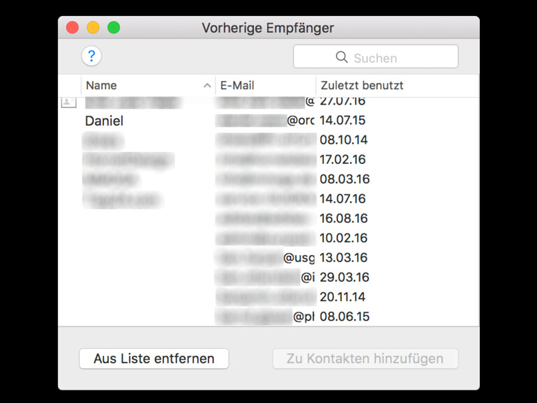 Die Liste der vorherigen Empfänger führt nur E-Mail-Adressen auf, an die Sie eine E-Mail verschickt haben. Ein Löschen der Mail löscht den Eintrag übrigens nicht aus der Liste. Dies muss bei Bedarf manuell vorgenommen werden.