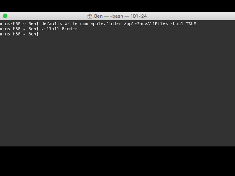 defaults write com.apple.finder AppleShowAllFiles -bool TRUE